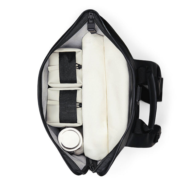 Sekken har også flere praktiske funksjoner, inkludert flere lommer på innsiden, en skjult glidelåslomme på baksiden og lommer til drikke på sidene. Den er utstyrt med en stropp på baksiden som gjør det enkelt å feste den til håndtaket på en trillekoffert for enkel transport. Kompresjonsstropper sørger for at innholdet holder seg på plass.