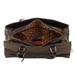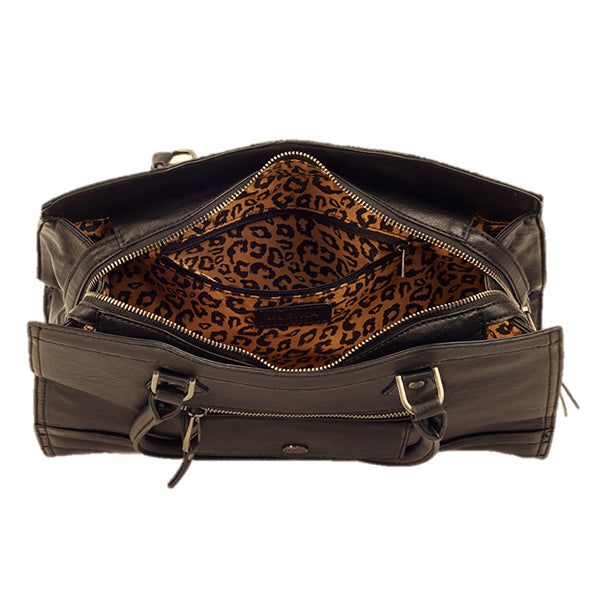 Forsiden har en liten glidelåslomme og et ekstra rom med klaff, mens baksiden har en praktisk glidelåslomme for småting du vil ha lett tilgjengelig. Hovedrommet åpnes med glidelås og byr på god plass til alt du trenger i løpet av dagen. Innvendig finner du en glidelåslomme og et åpent rom for enkel organisering, mens det luksuriøse leopardmønstrede fòret tilfører et eksklusivt preg.