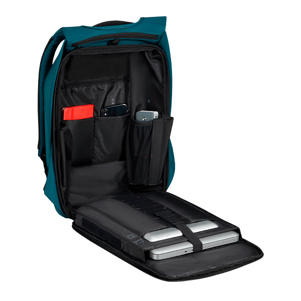 På innsiden finner du dedikerte lommer til mobil, nettbrett og laptop, i tillegg til en liten glidelåslomme og to åpne lommer for praktisk organisering. På utsiden har sekken to skjulte glidelåslommer, ene er RFID beskyttet, og den andre er ekstra sikret ved at skulderstroppene dekker den når du har sekken på. Dette gjør de perfekt til oppbevaring av verdisaker som du ønsker lett tilgang til, men som samtidig er godt beskyttet. I tillegg har sekken en koffertstropp på baksiden, slik at du enkelt kan feste den til drahåndtaket på en koffert og redusere belastningen under reisen.
