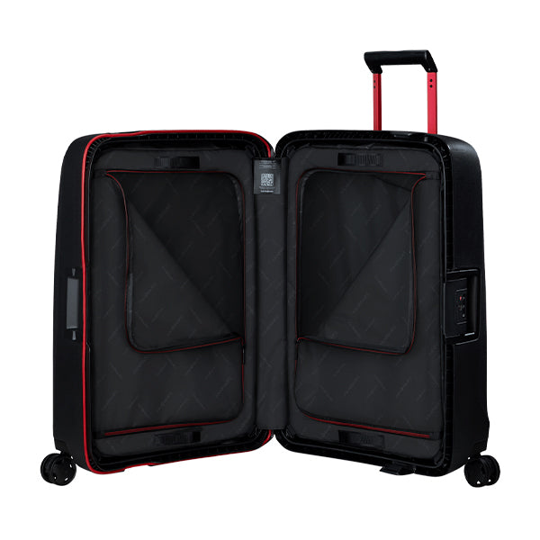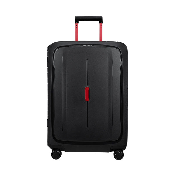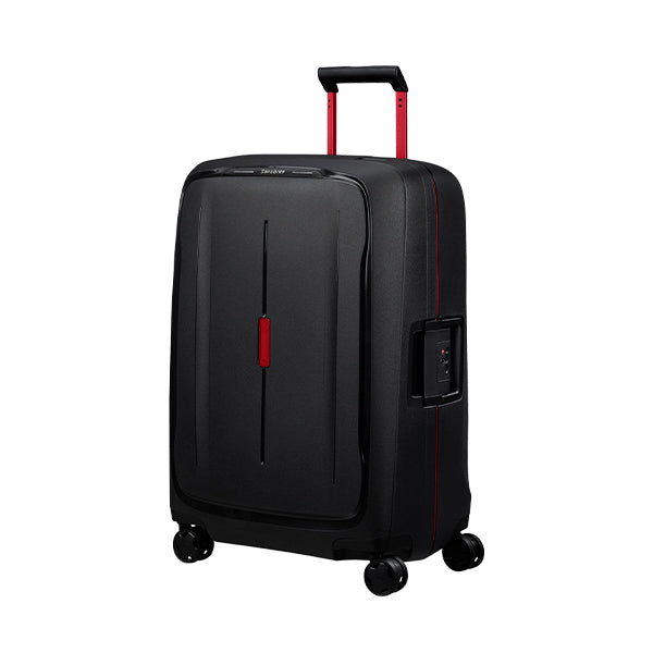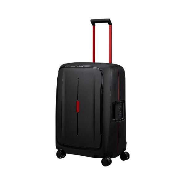 Essens er en robust og bærekraftig koffertmodell fra Samsonite, utstyrt med en pålitelig tre-punkts klipslås som inkluderer en kodelås på siden for ekstra sikkerhet. Kofferten har en praktisk gummilist langs åpningen som bidrar til å holde vann ute, men det er viktig å merke seg at den ikke er helt vanntett.