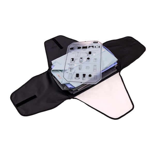 Mappen har justerbare vinger som komprimerer klærne for optimal plassutnyttelse, og et lett, sammenleggbart brett med praktiske bretteinstruksjoner sikrer presis pakking. Med plass til opptil 12 plagg er den et ideelt valg for både korte forretningsreiser og lengre ferier.