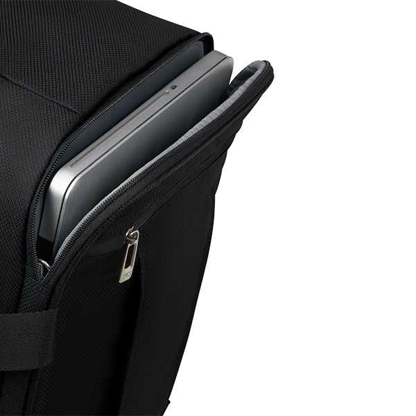 Hovedrommet er romslig og perfekt for deg som bare trenger å pakke med deg det viktigste. Her finner du elastiske stropper som holder klær og innhold på plass, en praktisk glidelåslomme til småting, og en toveis glidelåsåpning som kan låses med kodelås – smart når du er på farten. På baksiden har vesken en egen polstret lomme til laptop, slik at du enkelt får tilgang til den uten å åpne hele hovedrommet.