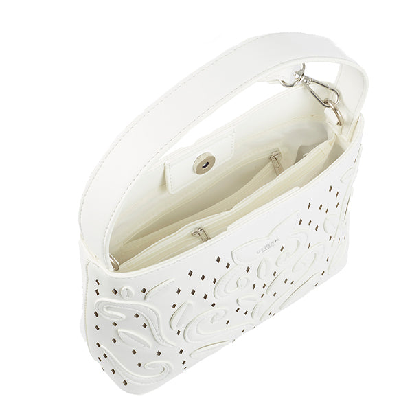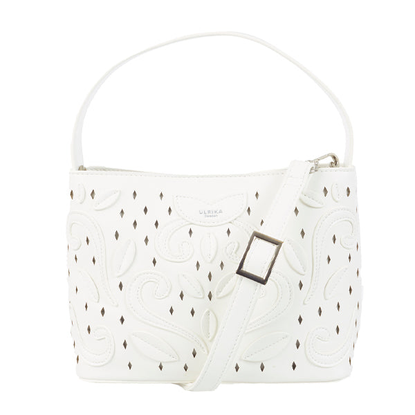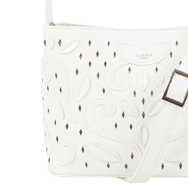 Liten veske fra Ulrika Sweden med vakre utskårne detaljer og et dekorativt, blomstret mønster i mykt materiale som minner om skinn. Et gjennomført design som både føles solid og ser elegant ut – perfekt til både hverdags og mer pyntede anledninger.