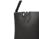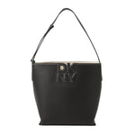 DKNY Nicole Bucket Bag kombinerer et tidløst uttrykk med en moderne, urban kant. Den sorte overflaten i teksturert kunstskinn gir vesken en markert karakter, mens den lyse kontrastsømmen tilfører et subtilt, men iøynefallende preg. Resultatet er en veske som balanserer det klassiske og det trendy på en elegant måte.