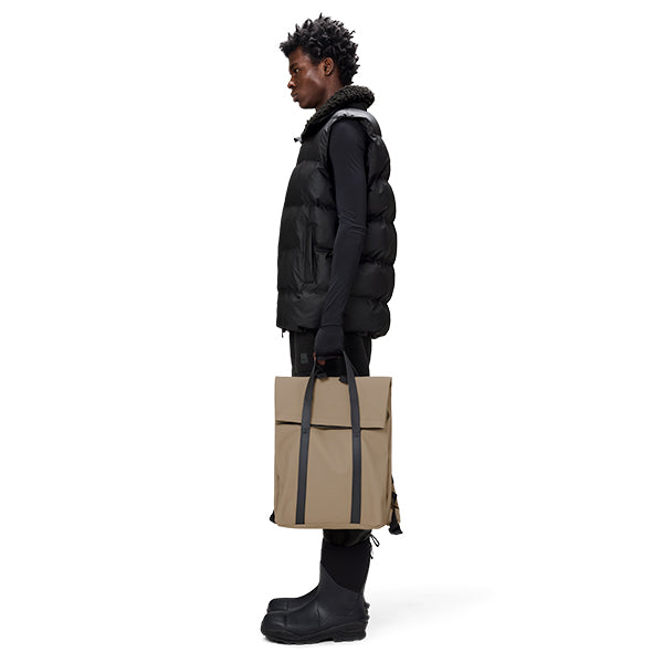2 Way Tote Backpack er laget i Rains’ signaturmateriale – et regntett og slitesterkt PU-stoff med glatt overflate, utviklet for å tåle daglig bruk med både komfort og stil.