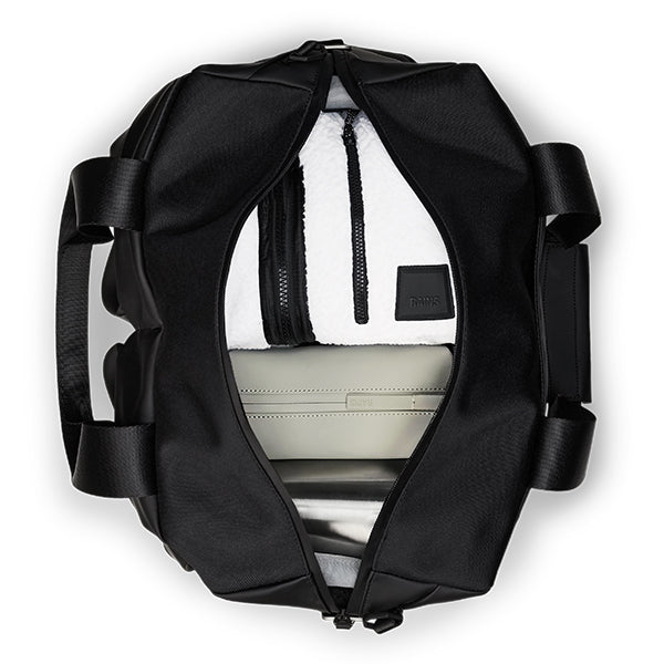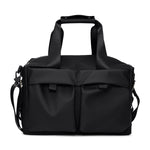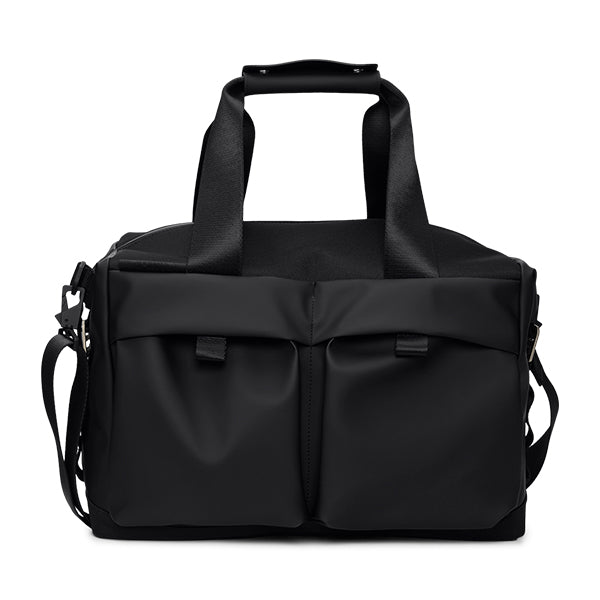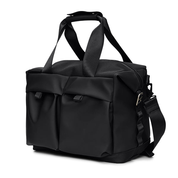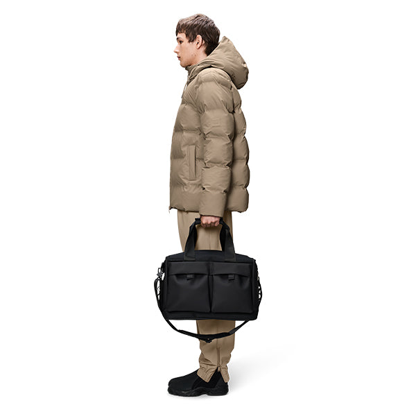 Designet fullføres med solide bærehåndtak i webbing og festeringer for den avtagbare skulderremmen, slik at du kan bære vesken på flere måter. Den er laget i en kombinasjon av Rains sitt regntette PU-materiale og slitesterkt, vevd polyester – utviklet for styrke, holdbarhet og en glatt finish.