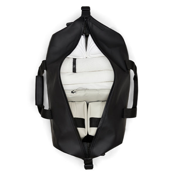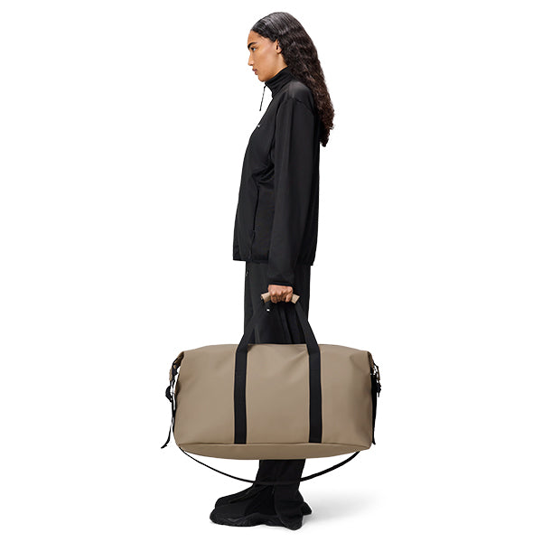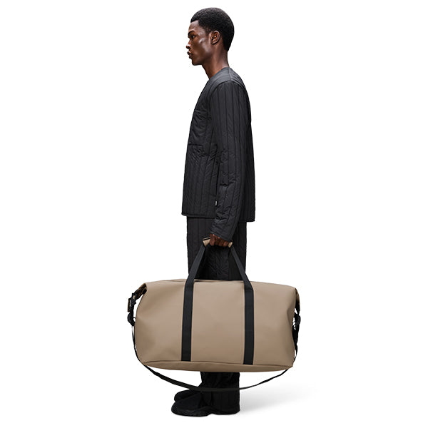 Moderne weekend bag fra Rains, baggen rommer alt du trenger til en helgetur borte. Den teipede glidelåsen på hovedrommet gir ikke bare en fin detalj, men sikrer også at innholdet er beskyttet mot vær og vind.