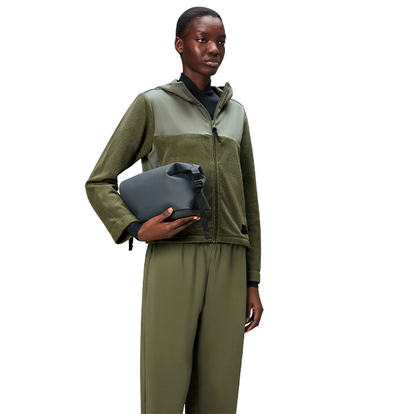 Hovedrommet på toalettmappen har glidelås, og toalettmappen har justerbare reimer på sidene slik at størrelsen kan justeres etter hvor mye en trenger å pakke med seg.