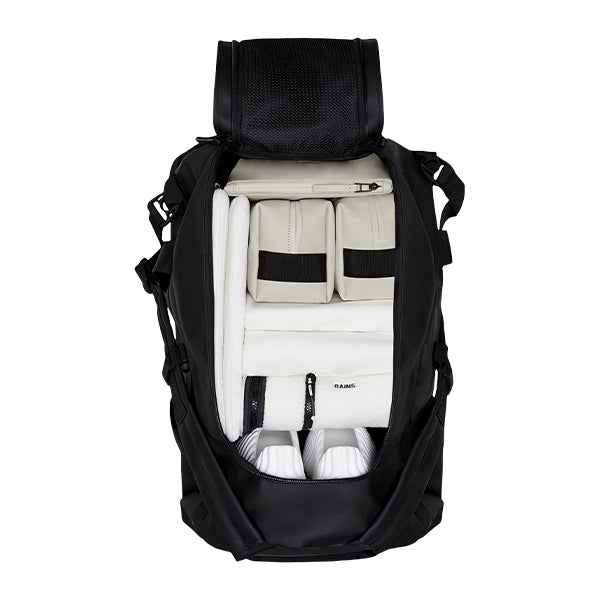Den sylinderformede fasongen gir en romslig og praktisk oppbevaring, mens den store U-formede glidelåsåpningen gjør det enkelt å pakke og få oversikt over innholdet. Hovedrommet har en praktisk sidelomme i mesh, mens innsiden av klaffen er utstyrt med to ekstra glidelåslommer i mesh for optimal organisering.