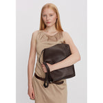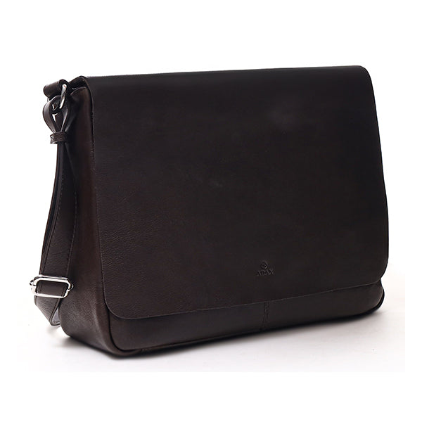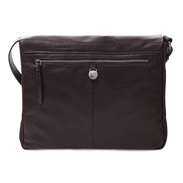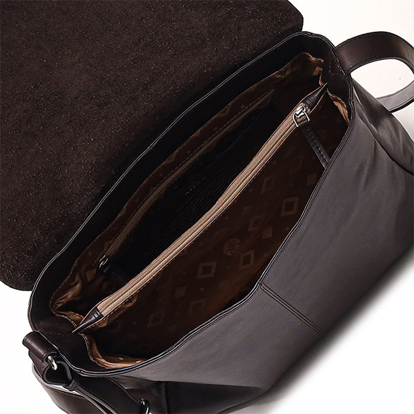 Vesken har et oversiktlig hovedrom med klaffelukking, og innvendig finner du et brunt fôr med mønster. Hovedrommet er delt av en romslig glidelåslomme som gjør det enkelt å holde orden, med god plass på hver side til dokumenter, laptop og andre nødvendigheter. På baksiden har vesken en praktisk utvendig glidelåslomme, perfekt for småting du vil ha rask tilgang til.