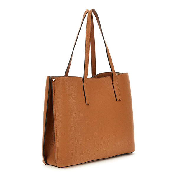 De to solide skulderhåndtakene gir komfortabel bæring, og den forsterkede bunnen med beskyttende metallføtter gjør at vesken står stødig og tåler daglig bruk. Den gullfargede GUESS-logoen på forsiden og det avtakbare logomerket tilfører en diskret signaturdetalj.