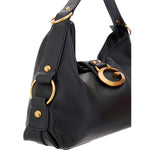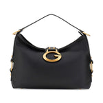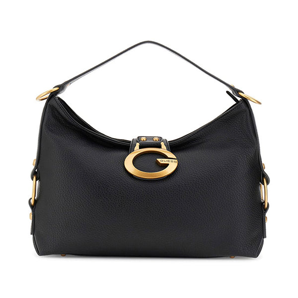 Denne skuldervesken fra Guess har et tidløst design med strukturert overflate og markerte metalldetaljer. Den brede skulderremmen med dekorative ringer og nagler gir et robust uttrykk, mens den store metallspennen i front tilfører vesken et snev av retrostil.