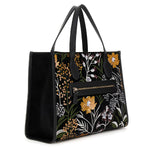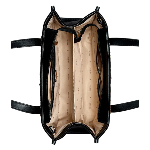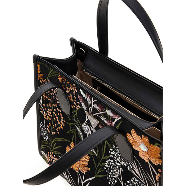 Guess Zalina 2 Compartment Tote er en elegant veske som virkelig skiller seg ut. Den glitrer i et vakkert spill av farger, der paljettene danner et detaljert plante- og blomstermønster mot den sorte bakgrunnen. Den ikoniske GUESS-logoen foran tilfører et eksklusivt preg som understreker veskenes luksuriøse uttrykk.