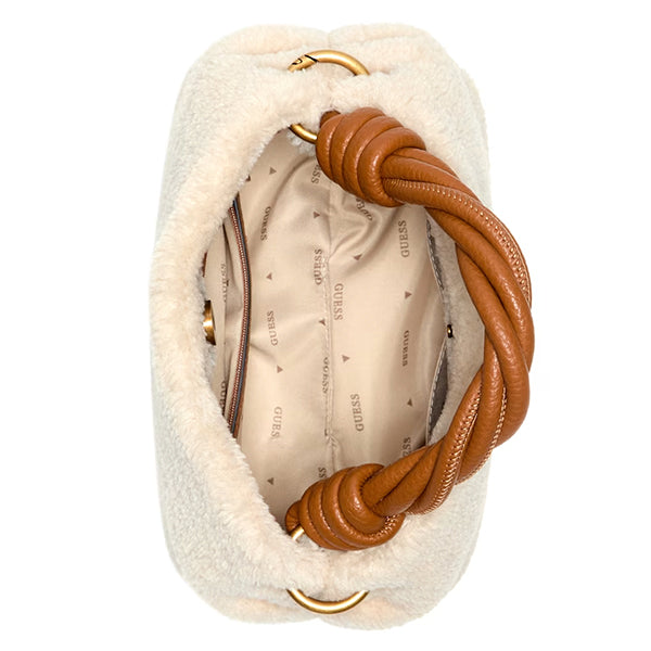 Denne vesken fra Guess kombinerer en leken teddy-finish med sofistikerte detaljer. Den myke overflaten gir et varmt og trendy uttrykk, mens det tvistede bærehåndtaket i PU tilfører en markant kontrast og gjør designet ekstra unikt.