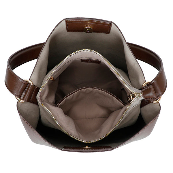 Innvendig finner du et to åpne avdelinger som lukkes med en praktisk magnetknapp. Midten har et stort glidelåsrom som gir trygg oppbevaring av verdisaker, og i tillegg finnes både en ekstra glidelåslomme og to åpne smårom som gjør det enkelt å organisere innholdet. Innsiden er kledd i lyst materiale som gir et ryddig og oversiktlig uttrykk.