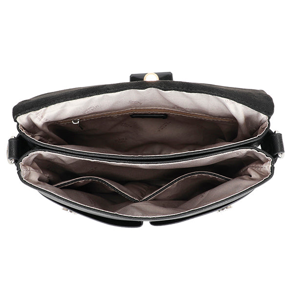 Hovedrommet lukkes med klaff og magnetknapp, og innvendig finner du et lyst fôr som gjør det enkelt å se innholdet. Vesken har to åpne avdelinger – i den ene ligger en liten glidelåslomme, mens den andre har to åpne små lommer. I tillegg finnes to åpne slide-in lommer på utsiden, rett under klaffen, perfekt for ting du vil ha rask tilgang til.
