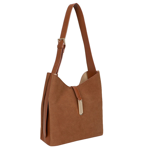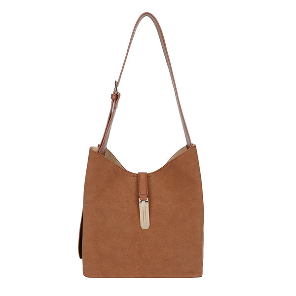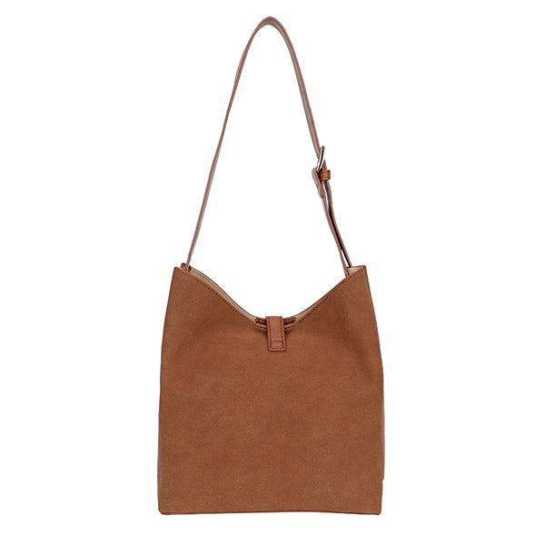 Denne vesken kombinerer et moderne uttrykk med en myk overflate som minner om semsket skinn, noe som gir den en elegant og samtidig avslappet stil. Den rene silhuetten løftes av en dekorativ metalldetalj på klaffen, som gir et diskret, men sofistikert preg.