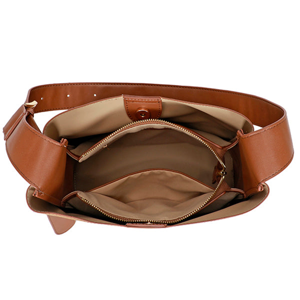 Innvendig er vesken delt i to åpne rom med et glidelåsrom i midten, perfekt for å holde orden på viktige eiendeler. I tillegg har den en liten åpen lomme som gir plass til småting du ønsker å ha lett tilgjengelig.