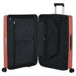 Kofferten har en toveis glidelås med TSA-kodelås. Innvendig er kofferten delt opp i to avdelinger, ene siden er dekket med duk og den andre har stropp med klipslås. Siden med duk har også en ekstra glidelåslomme, praktisk til oppbevaring av ladere og annet smått.