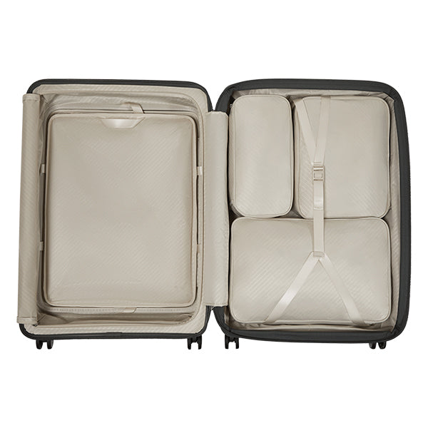Innvendig er kofferten utstyrt med både en fast og en justerbar skillevegg, inkludert en fuktavvisende lomme. I tillegg finner du en mesh-lomme og flere smarte detaljer som gjør det enkelt å holde oversikt. De medfølgende pakkekubene i ulike størrelser gjør det enkelt å organisere innholdet etter behov – ideelt både for korte og lengre reiser.