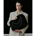 En romslig totebag i sort bouclé med ullblanding, designet med rørformede håndtak i imitert skinn og elegante knutedetaljer som setter et særpreget preg.