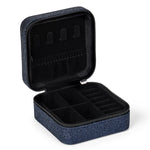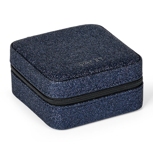 Dette firkantede smykkeskrinet kombinerer struktur og stil i et kompakt format. Den glitrende mørkeblå overflaten gir et elegant og iøynefallende preg, mens den sorte glidelåsen tilfører en diskret kontrast.