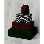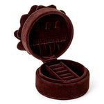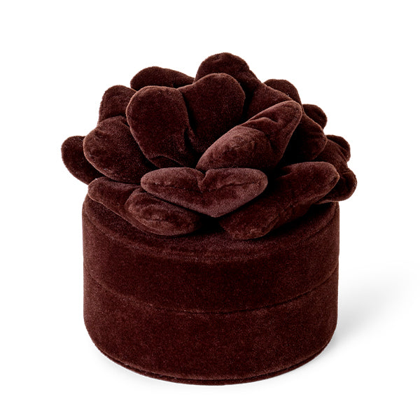 Et rundt smykkeskrin laget i myk velur, pyntet med en dekorativ blomst på lokket. Innvendig finner du en ringholder, delte rom og kroker til kjeder – alt utformet for å holde smykkene ryddig og lett tilgjengelig.