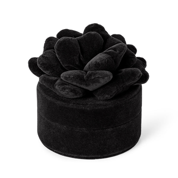 Et rundt smykkeskrin laget i myk velur, pyntet med en dekorativ blomst på lokket. Innvendig finner du en ringholder, delte rom og kroker til kjeder – alt utformet for å holde smykkene ryddig og lett tilgjengelig.