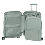 Kofferten åpnes med en toveis glidelås som enkelt låses med den integrerte TSA-kodelåsen. På innsiden finner du en fast skillevegg med nettinglomme og en quiltet lomme, samt en løs skillevegg med en romslig frontlomme med ekstra dybde. Det følger også med en egen våtlomme – en praktisk toalettmappe i vannavvisende materiale som festes til pakkestroppene. Den er designet for å beskytte klær og innhold mot eventuelle lekkasjer fra flytende produkter under reisen.