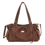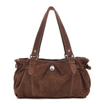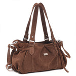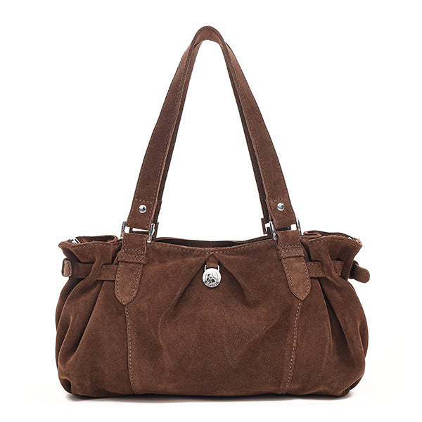 En romslig skulderveske i mykt semsket skinn med et elegant, drapert design. Vesken har et stort hovedrom med glidelåslukking, skillerom med glidelås i midten og flere innvendige lommer som gjør det enkelt å holde orden på eiendelene dine.