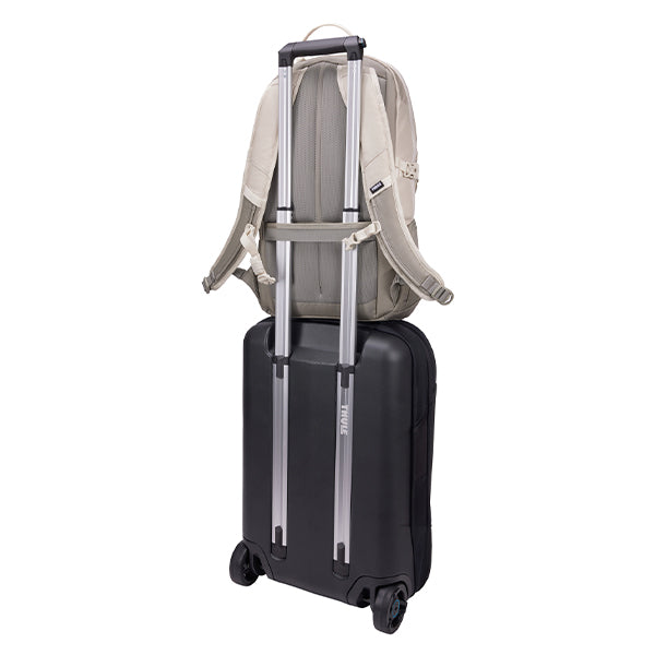 Sekken er komfortabel å bære, med bryststropp, polstret ryggpanel med luftkanal for bedre ventilasjon og kompresjonsremmer på sidene som bidrar til å balansere vekten. På baksiden finner du en praktisk gjennomgående stropp som gjør det mulig å feste sekken til rullende bagasje – perfekt på reise.