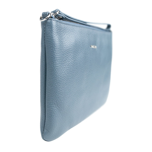 Håndleddsremmen er festet direkte i glidelåsen til hovedrommet, slik at vesken enkelt kan bæres som en clutch når du ønsker et minimalistisk uttrykk. Det følger også med en smal skulderrem i skinn som kan brukes både på skulderen og på cross. Remmen justeres med hull og kan kortes ned ytterligere ved å få laget et ekstra hull om ønskelig.