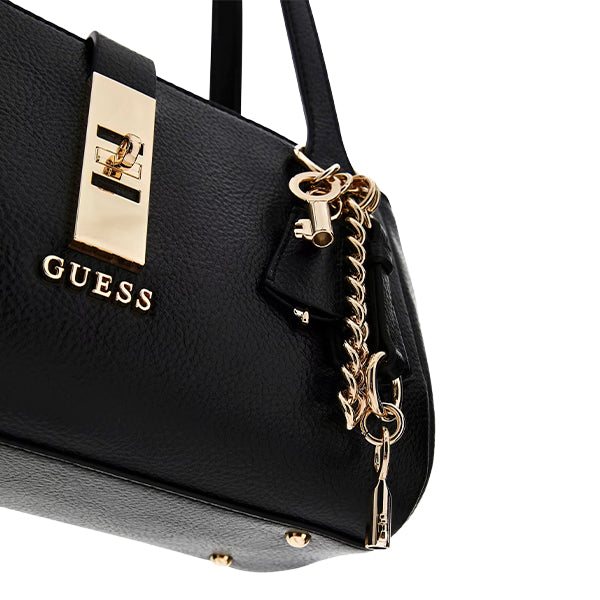 Dekorative anheng og nøkkelring tilfører vesken personlighet og gir en fin kontrast til det rene, sorte designet. Med forsterket bunn og beskyttende føtter står vesken stødig når den settes fra seg, og den tydelige GUESS-logoen understreker det ikoniske uttrykket.