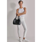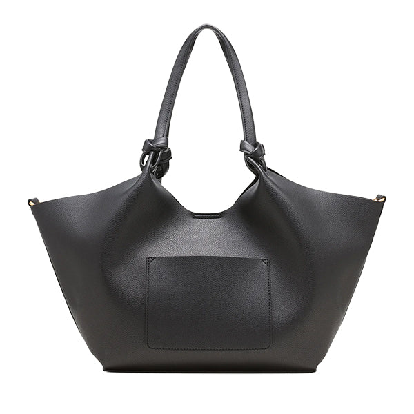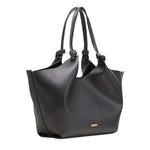 De karakteristiske topphåndtakene med knutedetaljer gir vesken et særpreget preg, mens krokene på hver side kan festes sammen innvendig for å gi vesken et smalere og mer strukturert uttrykk når du ønsker det.