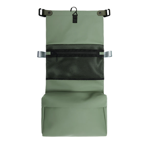 Den smarte trifold-utformingen åpnes opp og gir god oversikt over innholdet. Toalettmappen har et hovedrom med glidelås, en innvendig mesh-lomme til børster og redskaper, samt en utvendig glidelåslomme for småting du vil ha rask tilgang til. Når vesken foldes ut, kan den henges opp med den integrerte kroken – perfekt for hotellbad, treningsgarderober eller kontorfasiliteter. Klaffen med C-clips sørger for at innholdet holdes sikkert på plass når vesken er lukket.