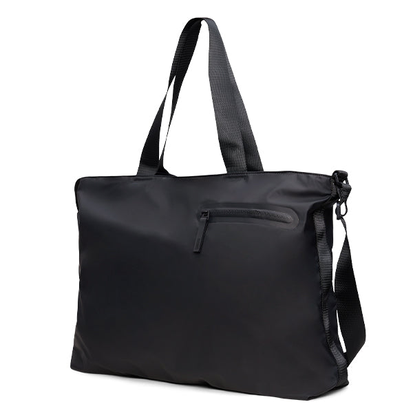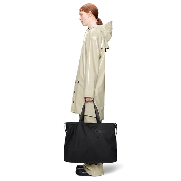 Webbing-håndtakene gir et klassisk tote-uttrykk, mens den justerbare skulderstroppen gjør det enkelt å bære vesken over skulderen eller crossbody når du ønsker frie hender. Dash Messenger Tote Bag er laget i Rains sitt karakteristiske, regntette PU-materiale med myk bakside, som gir god slitestyrke, fleksibilitet og enkel oppbevaring når vesken ikke er i bruk.
