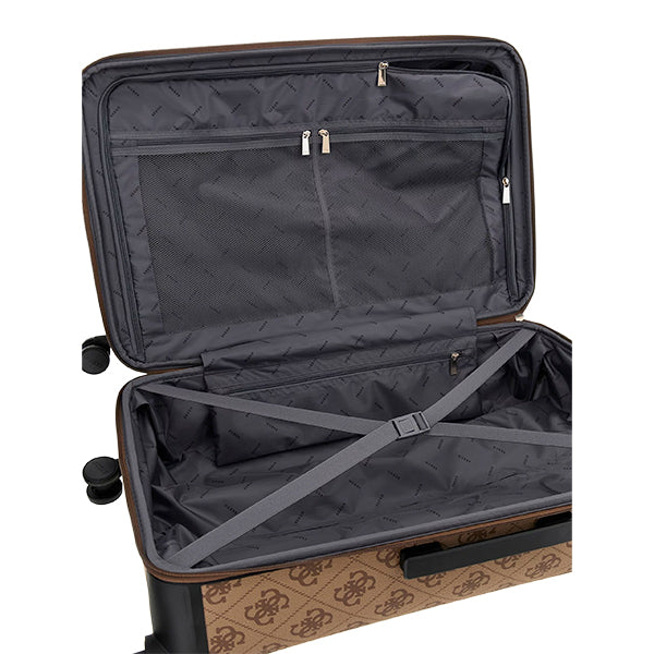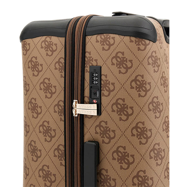 Denne elegante kofferten fra Guess kombinerer et iøynefallende design med praktiske detaljer som gjør lengre reiser mer komfortable. Den er laget i slitesterk ABS-plast med forsterkede kanter og beskyttende føtter, og preges av det karakteristiske Guess-logo-mønsteret som gir et luksuriøst uttrykk.