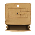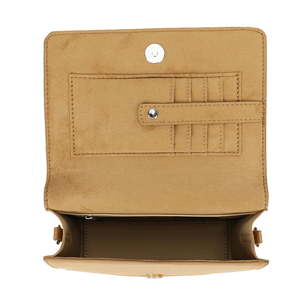 Vesken lukkes med klaff og magnetknapp, og åpner opp til en oversiktlig innside med en åpen hovedavdeling. Her finner du en liten glidelåslomme for trygg oppbevaring av små verdisaker, samt en praktisk, integrert kortlomme med plass til fire kort på innsiden av klaffen. Dette gjør at du enkelt kan organisere kort, mobil og andre nødvendigheter uten å måtte bruke ekstra lommebok.