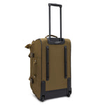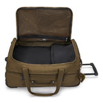 Trillebaggen har stropper til å bæres i hånden, bærehåndtak på toppen og på siden, og et drahåndtak til å trille baggen med.