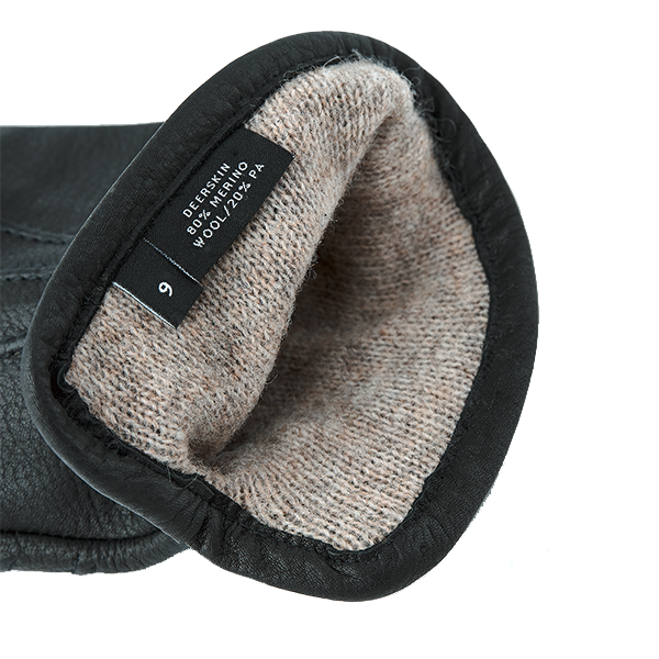 Hanskene er laget av skinnet fra hjort, innvendig har hanskene strikket ullfor som holder hendene varme og lune ned til -5 grader celsius.