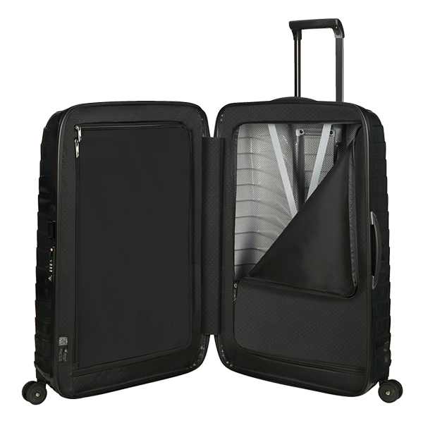 Hovedrommet på kofferten har en praktisk toveis glidelås, som kan låses sikkert med den innebygde TSA-kodelåsen på siden. Inne i kofferten finner du en praktisk oppdeling med skilleduker med glidelås på hver side, samt en ekstra nettinglomme med glidelås for oppbevaring av mindre gjenstander. På baksiden av den ene skilleduken finner du også en koffertstropp med klipslås, som gir ekstra støtte til innholdet.