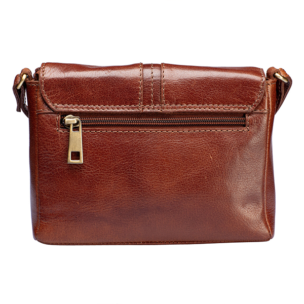 Vesken har en utvendig liten glidelåslomme på baksiden, hovedrommet har både klaff og glidelås.
