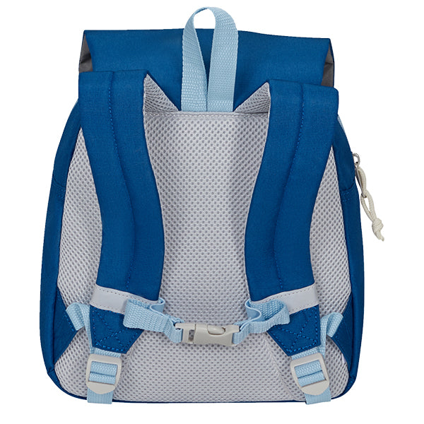Sekken har en figurformet klaff som lukkes med borrelås, og under klaffen finner du en romslig glidelåslomme med plass til alt fra kosedyr til matpakke. De myke, polstrede skulderreimene og den justerbare brystreimen sikrer at sekken sitter godt på ryggen, selv for de minste.