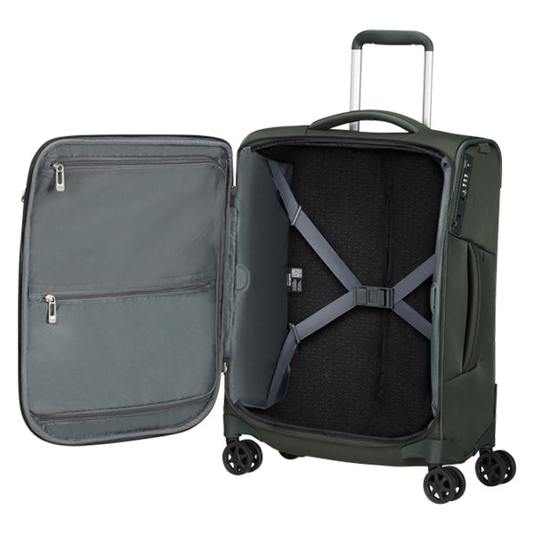 Hovedrommet har toveis glidelås som tres inn i kodelåsen når en skal låse kofferten. Innvendig har kofferten en stor og romslig pakkeavdeling på ene siden, og en skilleduk med glidelås på andre siden.