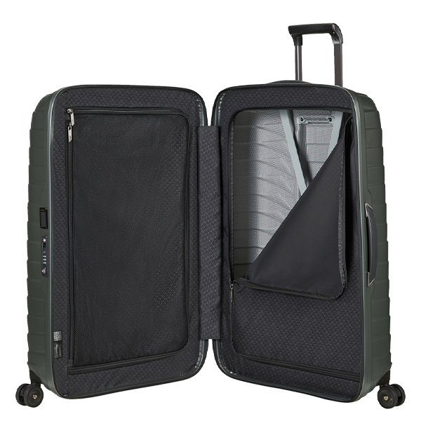 Hovedrommet på kofferten har en praktisk toveis glidelås, som kan låses sikkert med den innebygde TSA-kodelåsen på siden. Inne i kofferten finner du en praktisk oppdeling med skilleduker med glidelås på hver side, samt en ekstra nettinglomme med glidelås for oppbevaring av mindre gjenstander. På baksiden av den ene skilleduken finner du også en koffertstropp med klipslås, som gir ekstra støtte til innholdet.