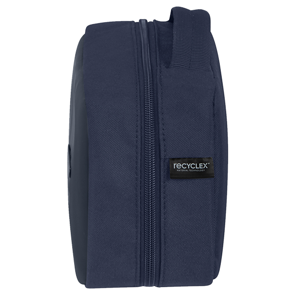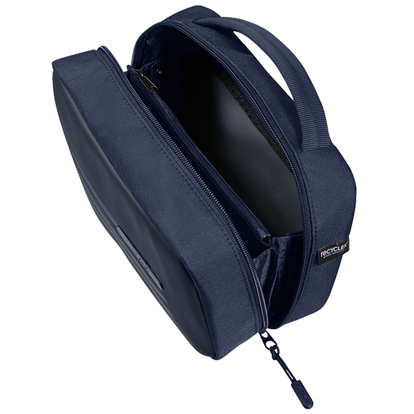 Toalettmappen har en toveis glidelås. Innvendig har den en skillelomme i midten med glidelås og en våtlomme med glidelås.