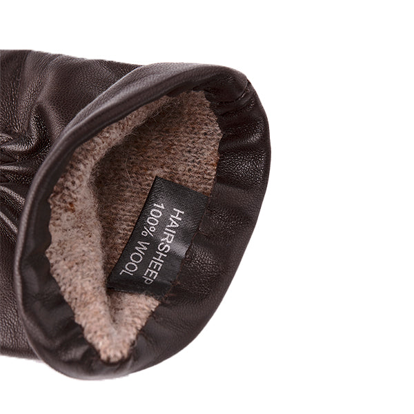 Hanskene er laget av skinnet fra Sau, innvendig har hanskene strikket ullfor som holder hendene varme og lune ned til -5 grader celsius.