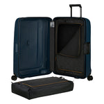 Essens er en robust og bærekraftig koffertmodell fra Samsonite, utstyrt med en pålitelig tre-punkts klipslås som inkluderer en kodelås på siden for ekstra sikkerhet. Kofferten har en praktisk gummilist langs åpningen som bidrar til å holde vann ute, men det er viktig å merke seg at den ikke er helt vanntett.