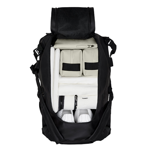 Den sylinderformede fasongen gir en romslig og praktisk oppbevaring, mens den store U-formede glidelåsåpningen gjør det enkelt å pakke og få oversikt over innholdet. Hovedrommet har en praktisk sidelomme i mesh, mens innsiden av klaffen er utstyrt med to ekstra glidelåslommer i mesh for optimal organisering.