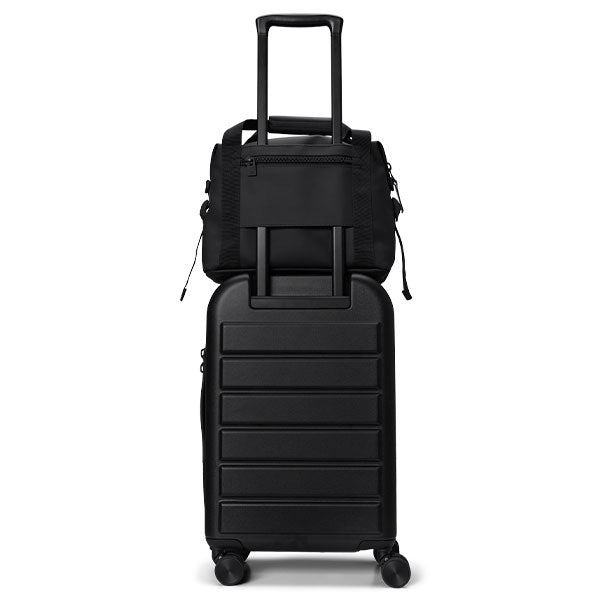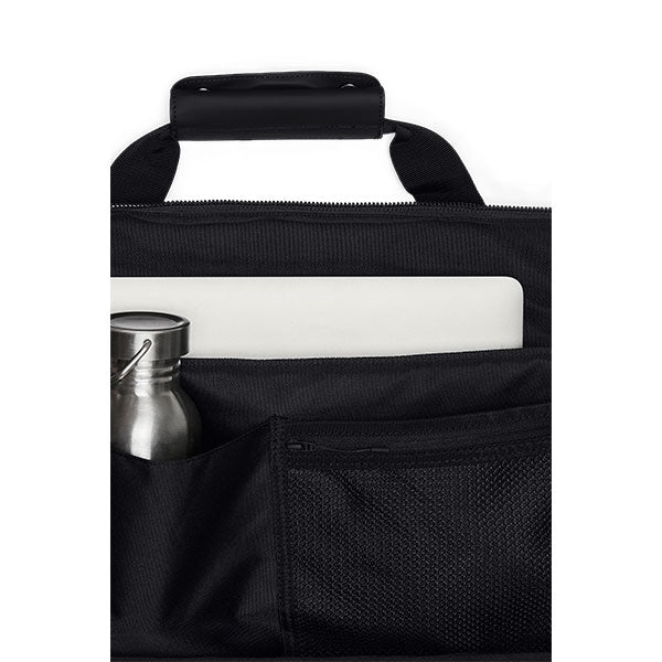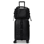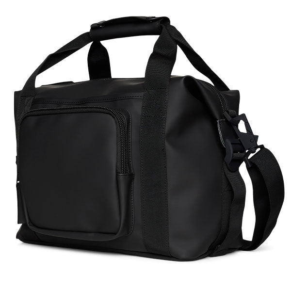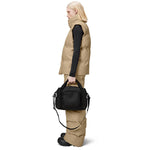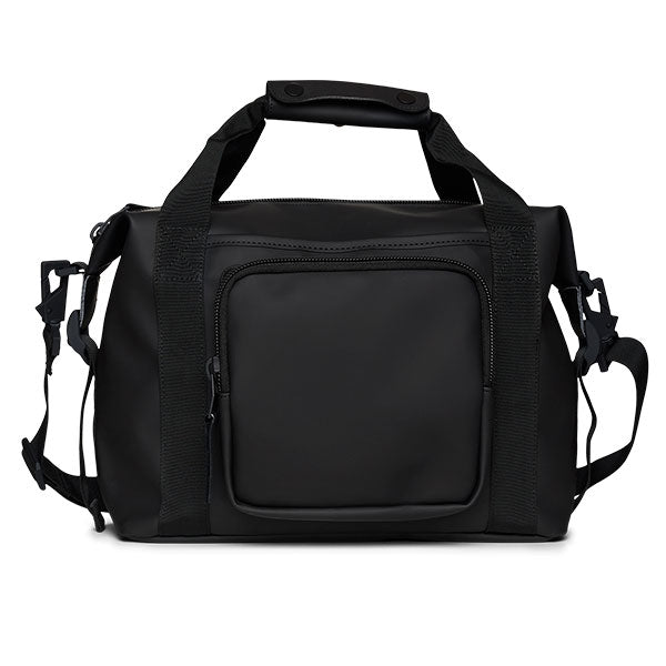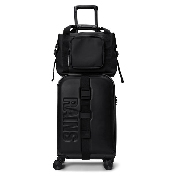 Moderne liten bag fra Rains, perfekt å ha med på reise eller i hverdagen. Baggen har en utvendig koffertstropp på baksiden. Du kan da enkelt tre den ned på drahåndtaket til en koffert når du er på reise.